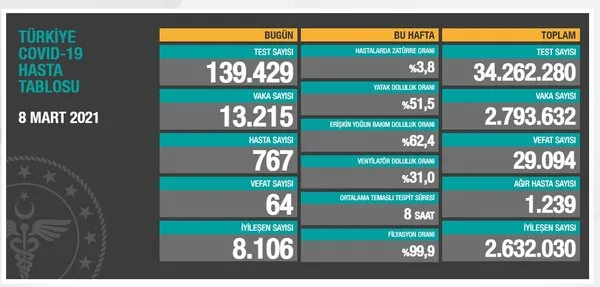 Vaka sayısı 15.197, hasta sayısı 2.816, ağır hasta sayısı 4.251 ve vefat sayısı 257′ dir.