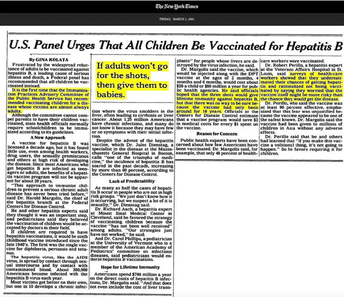 Hepatit B aşısının bebeklere yapılmasını eleştiriyor, bunun kamu sağlığı değil, ilaç şirketlerinin (özellikle Merck’ in) kâr motivasyonuyla gerçekleştiğini savunuyor.